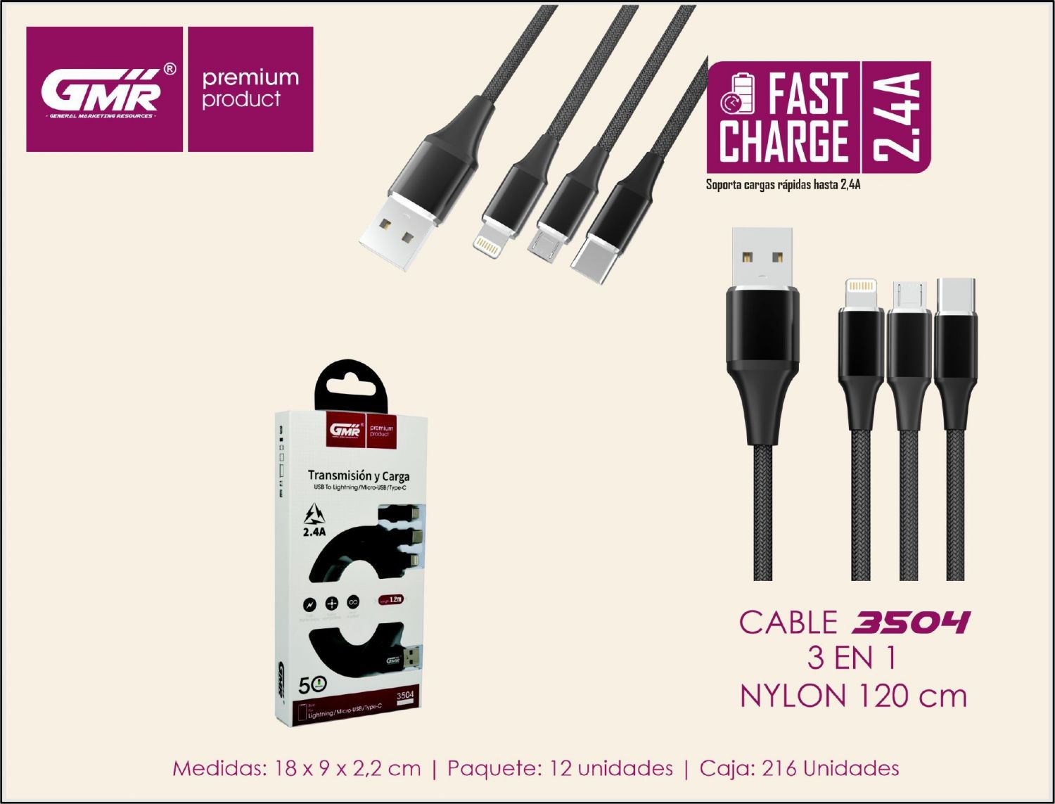 GMR PREMIUM CABLE NYLÓN 3 EN 1 2,4A 120CM