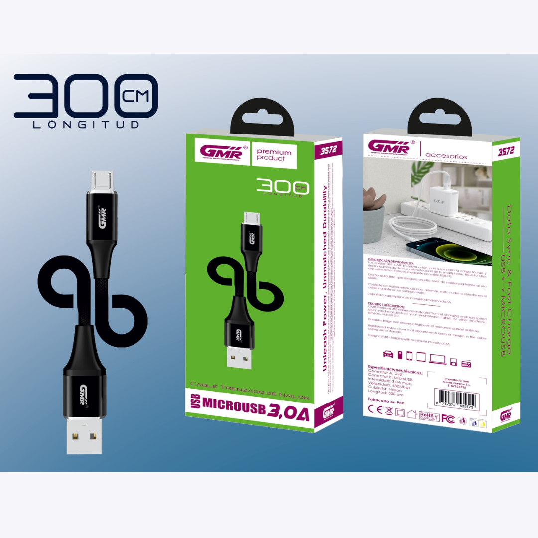 GMR PREMIUM CABLE NYLON USB A MICROUSB 3.0A 300CM